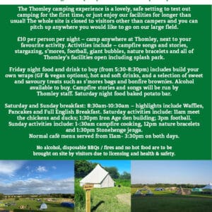 £10 per person to camp. Limited spaces. No fires or cooking allowed on site. No hot food is allowed to be brought on site.