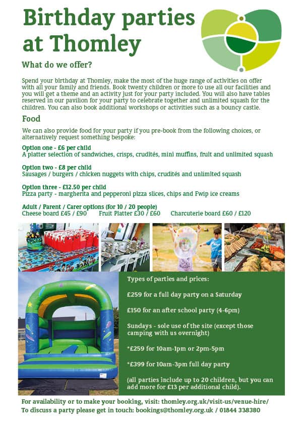 Come and spend your birthday at Thomley, make the most of the huge range of activities on offer with all your family and friends. Book for twenty children or more to use all our facilities and add on extras, or an art and craft / physical activity, led by one of the Thomley team. Our parties have become very popular, so please book in advance. For further information see the birthday party poster: